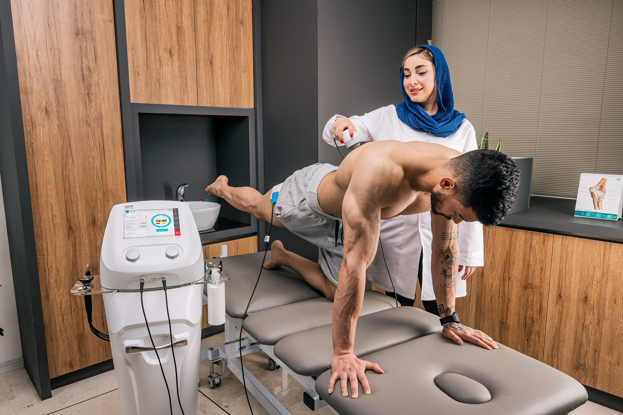 • البروتوكولات العلاجية المحددة مسبقًا، الدقيقة والفعالة، والمبنية على مقالات علمية موثوقة، تُقدَّم مع معلومات تكميلية تشمل عدد جلسات العلاج، والفواصل الزمنية بين الجلسات، وصور إرشادية لتحديد المواضع الدقيقة لوضع مقابض الجهاز (الهاند بيس)، وعرض وضعية المريض أثناء العلاج. كما أن وجود مكتبة من الصور التشريحية لأجزاء مختلفة من الأطراف العلوية والسفلية، لا يوسّع فقط نطاق استخدامات الجهاز، بل يسهل أيضًا التواصل بين المعالج والمريض.